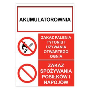 AKUMULATOROWNIA - ZAKAZ PALENIA TYTONIU... - ZAKAZ SPOŻYWANIA POSIŁKÓW..., płyta PVC 1 mm, 148x210 mm