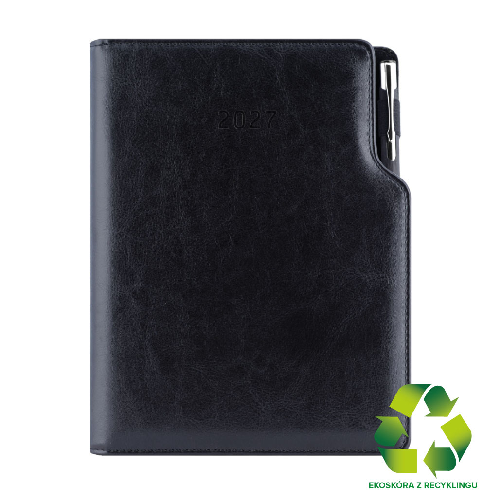Kalendarz książkowy GEP z długopisem tygodniowy A5 2027 polski - czarny (czarne wnętrze) - skóra ekologiczna z recykling