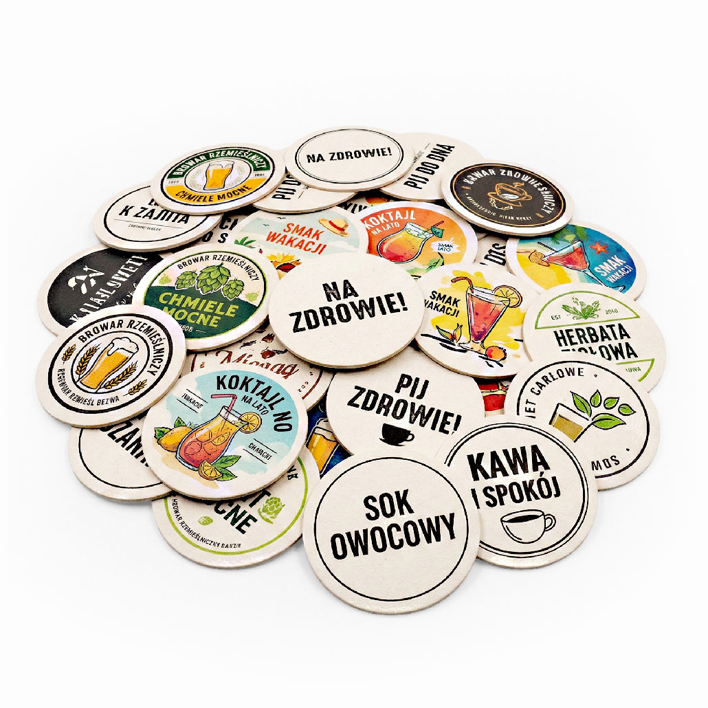 Produkujemy podkładki pod piwo na zamówienie ze specjalnego papieru o gramaturze 610 g i grubości 1,5 mm.