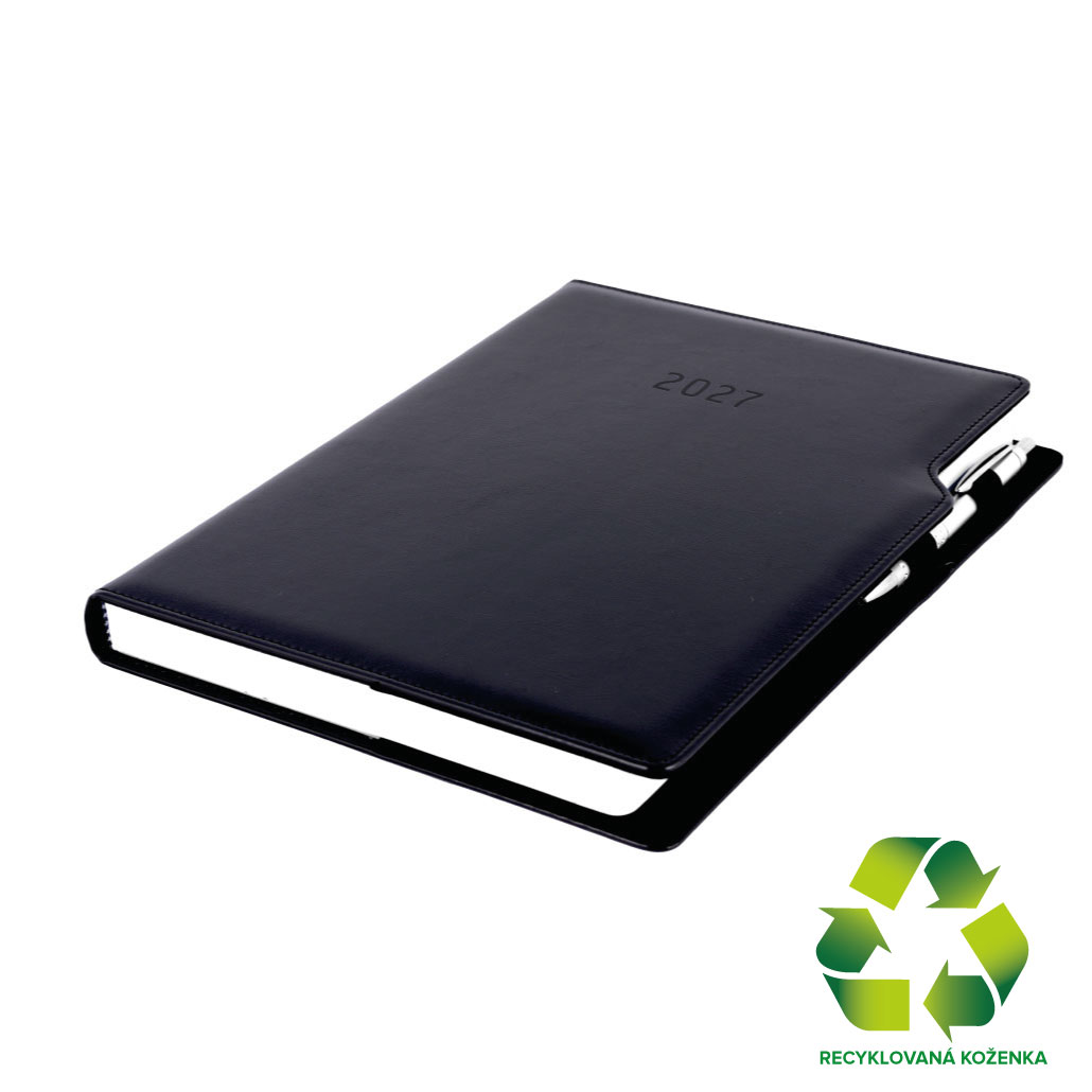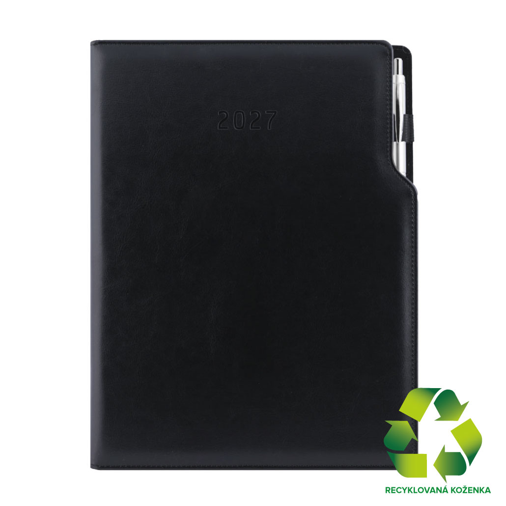 Diář GEP s propiskou denní A4 2027 - černá/černý vnitřek - recyklovaná koženka