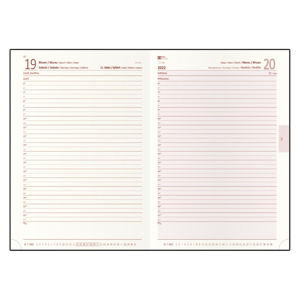 Rozmiar bloku: 143 x 205 mm Format: A5 Kalendarium: dzienne czeskie i słowackie z imionami (SO/NE osobno na stronie) Mutacje językowe: CZ, SK, ANG, D, RU Materiał wierzchni: drobno strukturyzowany Kolor bloku: kremowy, okrągłe odrywane rogi Ilość s