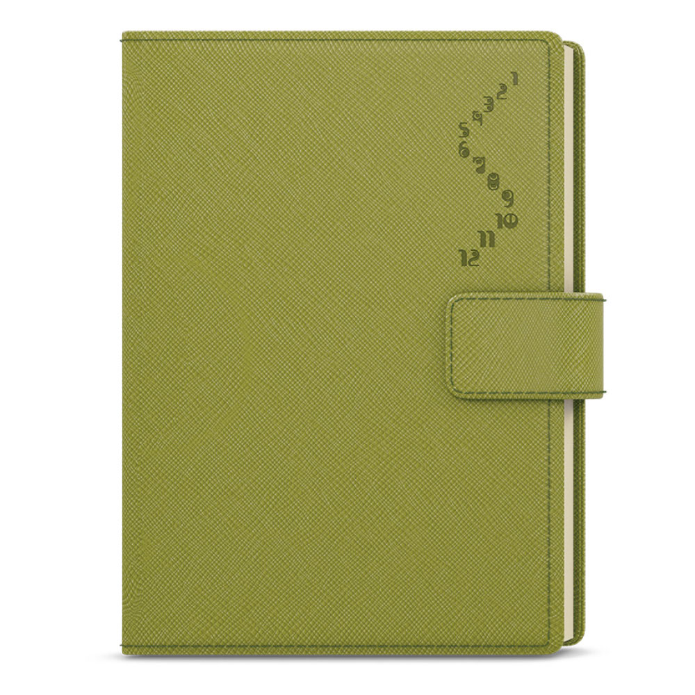 Ślepe tłoczenie roku, magnetyczne zapinanie, pętelkę na długopis, 3 wewnętrze kieszenie.