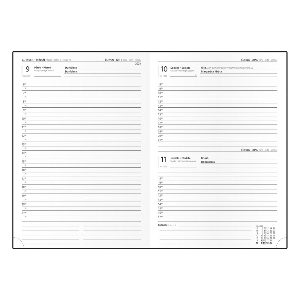 Rozmiar bloku: 143 x 205 mm Format: A5 Kalendarium: dzienne czeskie i słowackie z imionami Mutacje językowe: CZ, SK, ANG, D, RU Materiał wierzchni: strukturalny Kolor bloku: laminat matowy z częściowym lakierem Ilość stron: 352 stron Wiązanie: sze