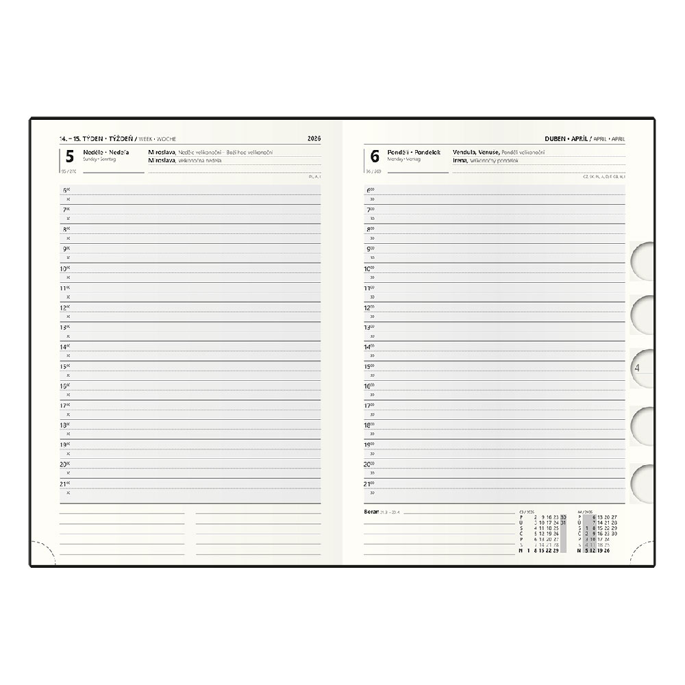 Wymiary: 143 x 205 mm Format: A5 Kalendarz: dzienny nominalny czeski i słowacki (sobota/niedziela osobno na stronie) Mutacje językowe: CZ, SK, EN, DE Materiał okładki: miękki, gładki materiał o błyszczącej powierzchni Papier: kremowy z perforowanymi