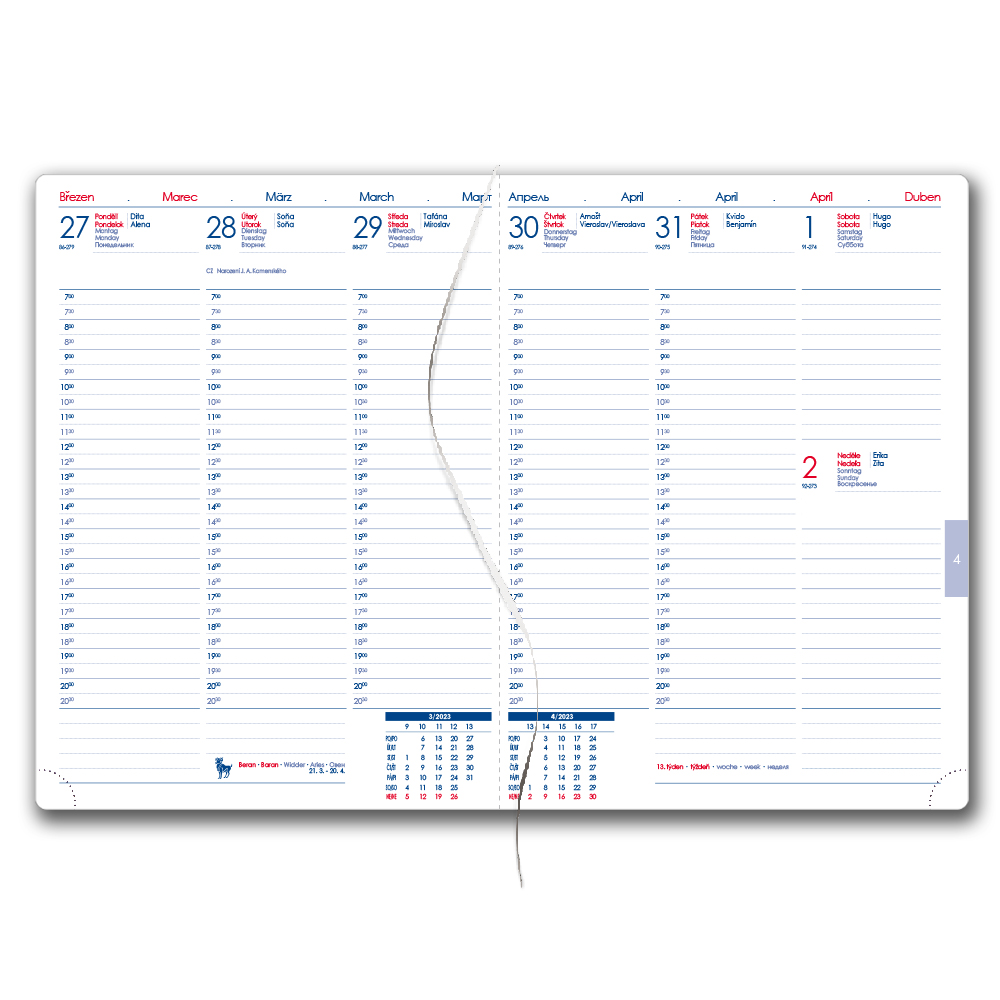 Format: B6 Rozmiar bloku: 120 x 165 mm Ilość stron: 144 stron Wiązanie: szew V8 Kalendarium: tygodniowe czeskie i słowackie z imieninami Mutacje językowe: PL, EN, DE, RU Kolor bloku: biały Kolor czcionki: niebieski i czerwony Materiał: skóra ek
