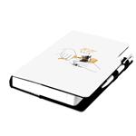 Zawiera: okrągłe odrywane rogi, białą zakładkę i długopis