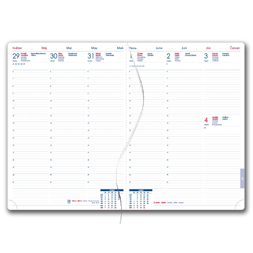 Format: A4 Rozmiar bloku: 210 x 293 mm Ilość stron: 144 stron Wiązanie: szew V8 (tkana nić) Kalendarium: tygodniowe czeskie i słowackie z imieninami Mutacje językowe: PL, EN, DE, RU Kolor bloku: biały Kolor czcionki: niebieski i czerwony Materia