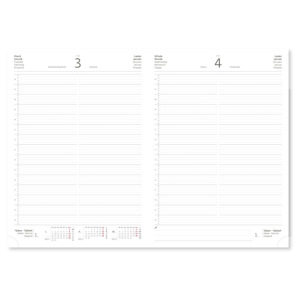Rozmiar: 210 x 297 mm Format: A4 Kalendarium: dzienne czeskie/słowackie Liczba stron 400 Kolor bloku: biały Wiązanie: V8 Materiał: matowa skóra ekologiczna Zawiera: dane osobowe, planer urlopów, kalendarz planowania, numery kierunkowe, święta
