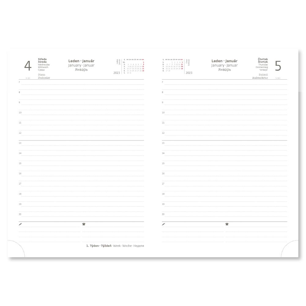 Rozmiar: 145 x 205 mm Format: A5 Kalendarium: dzienne czeskie/słowackie Liczba stron: 352 stron Kolor bloku: biały Wiązanie: V8 Materiał: matowa skóra ekologiczna Zawiera: dane osobowe, planer urlopów, kalendarz planowania, numery kierunkowe, ś