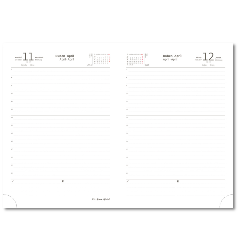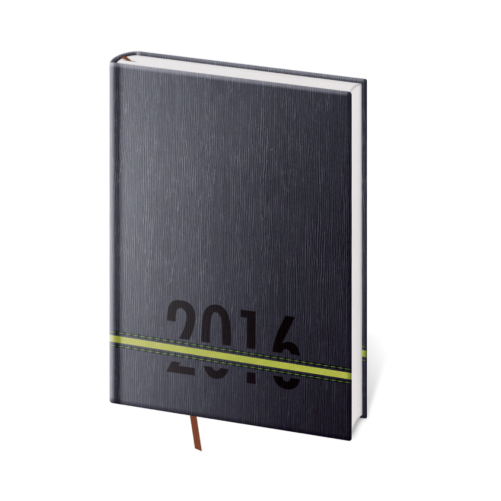 Kalendarz książkowy 2016 Dzienny A5 Stripes - czarny/zielony Format: 143 x 205 mm Liczba stron: 352 Łączenie - szew V8 Kolor bloku - biały Kalendarium dzienne Dane osobowe, planer urlopu (miesięczny podgląd), planer, strefy czasowe, odległości miast CZ