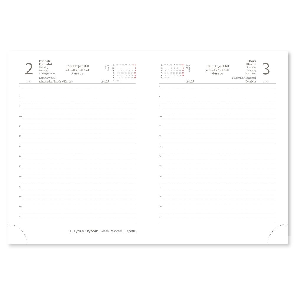 Rozmiar: 120 x 165 mm Format: B6 Kalendarium: dzienne czeskie/słowackie Liczba stron 352 Kolor bloku: biały Wiązanie: V8 Materiał: matowa skóra ekologiczna Zawiera: dane osobowe, planer urlopów, kalendarz planowania, numery kierunkowe, święta