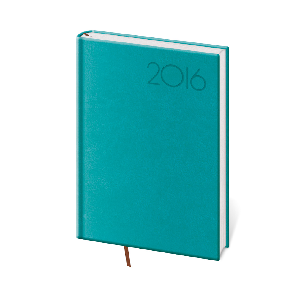 Kalendarz książkowy 2016 Dzienny B6 Print Pop - turkusowy Format: 120 x 165 mm Liczba stron: 336 Łączenie - szew V8 Kolor bloku - biały Kalendarium dzienne Dane osobowe, planer urlopu (miesięczny podgląd), planer, strefy czasowe, odległości miast CZ i