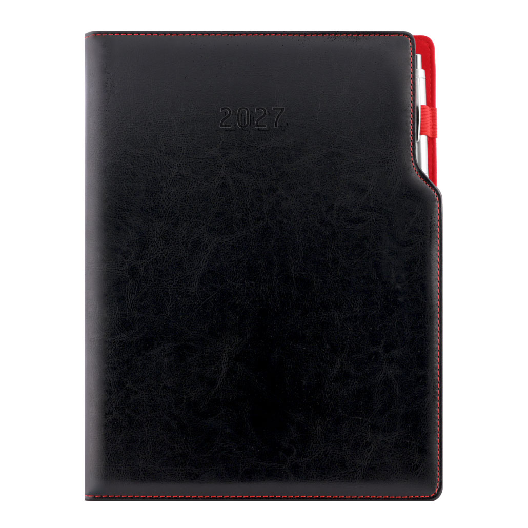 Kalendarz książkowy GEP z długopisem dzienny A4 2027 polski - czarny (czerwone wnętrze)
