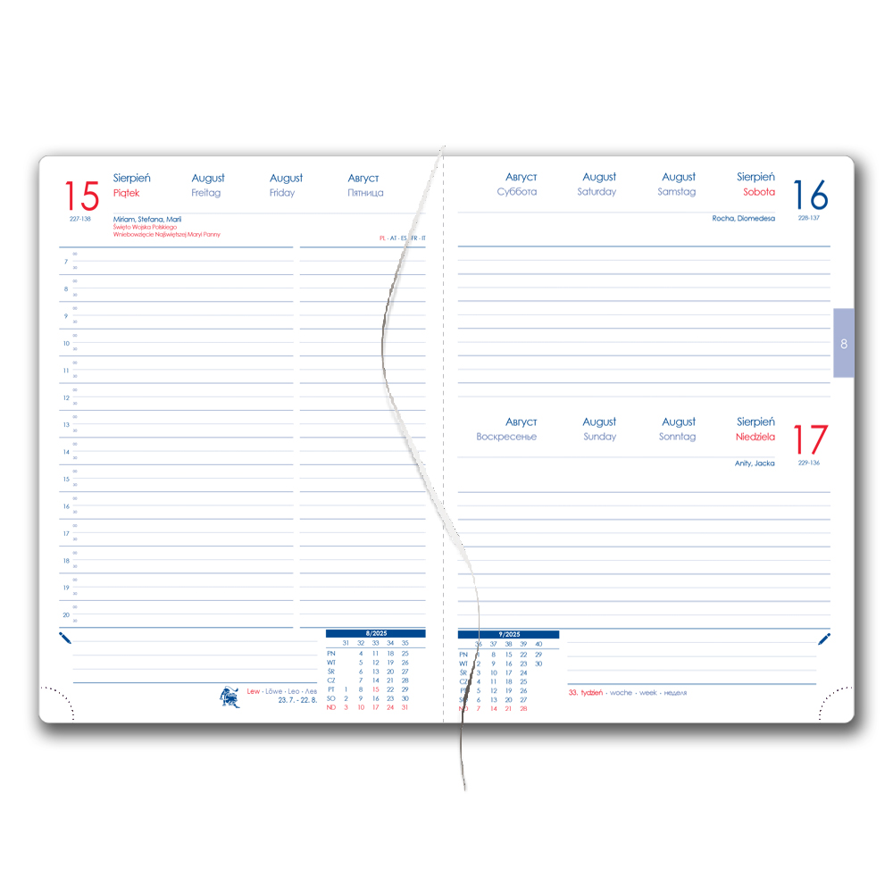 Format: B6 Rozmiar bloku: 120 x 165 mm Ilość stron: 348 stron Wiązanie: szew V8 Kalendarium: dzienne polskie z imieninami Mutacje językowe: PL, EN, DE, RU Kolor bloku: biały Kolor czcionki: niebieski i czerwony Mapy: PL, WARSZAWA Materiał wier