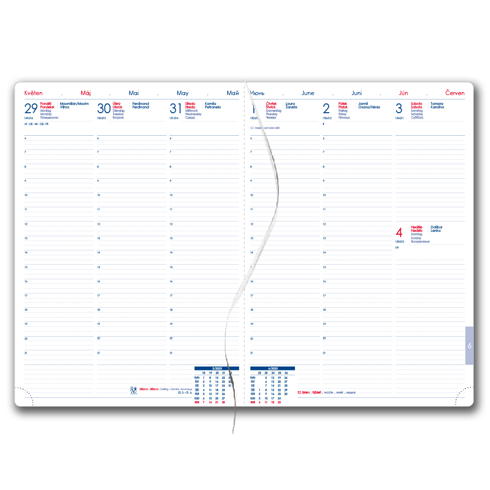 Format: A4 Rozmiar bloku: 210 x 293 mm Ilość stron: 144 stron Wiązanie: szew V8 Kalendarium: tygodniowe czeskie i słowackie z imieninami Mutacje językowe: PL, EN, DE, RU Kolor bloku: biały Kolor czcionki: niebieski i czerwony Materiał wierzchni
