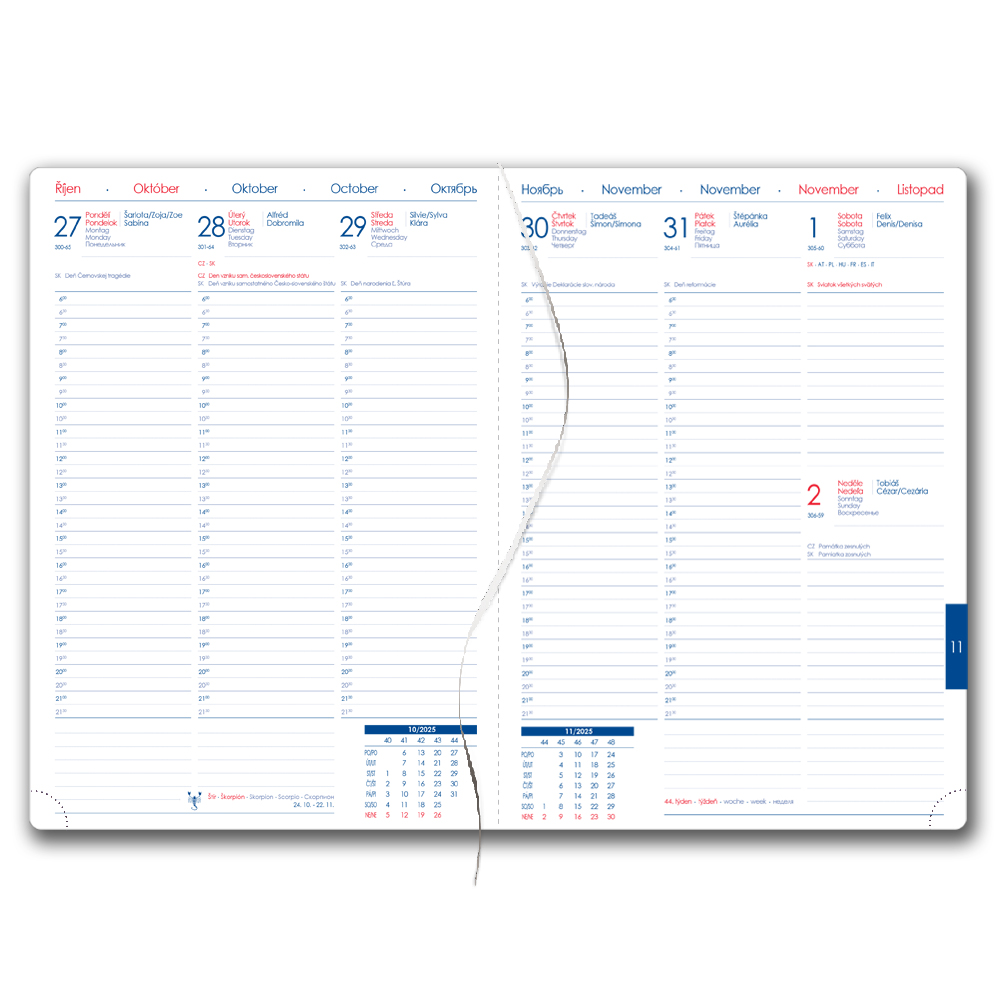 Format: B5 Rozmiar bloku: 170 x 250 mm Ilość stron: 144 stron Wiązanie: szew V8 Kalendarium: dzienne czeskie i słowackie z imieninami Języki: CZ, SK, EN, DE, RU Kolor bloku - biały, okrągłe odrywane rogi, biała zakładka, sobota i niedziela na os