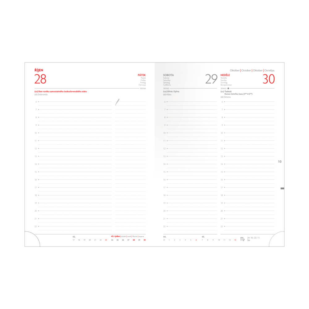 Kalendarz książkowy Juliet 2016 dzienny A5 - pomarańczowy Format: 148 x 210 mm Kalendarium: dzienne Zakres: 352 stron, papier - biały Materiał wierzchni: skóra ekologiczna Główny język: czeski, inne języki: SK, ANG, D, RU Strony informacyjne: czeskie i sł