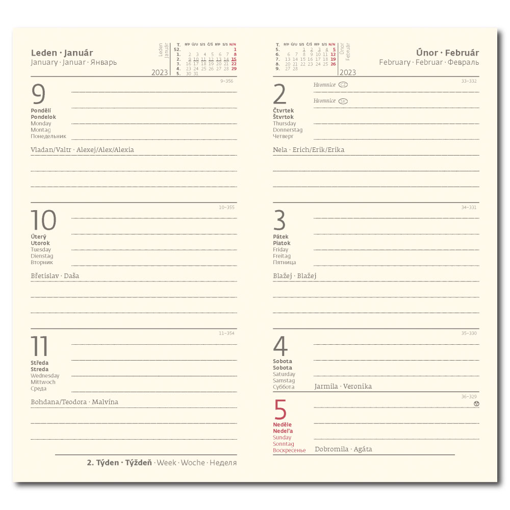 Rozmiar: 80 x 150 mm Format: kieszonkowy Kalendarium: tygodniowe czeskie/słowackie Liczba stron: 128 Kolor bloku: kremowy Wiązanie: V8 Materiał: skóra ekologiczna o ząbkowanej strukturze Zawiera: dane osobowe, planer urlopów, kalendarz planowania