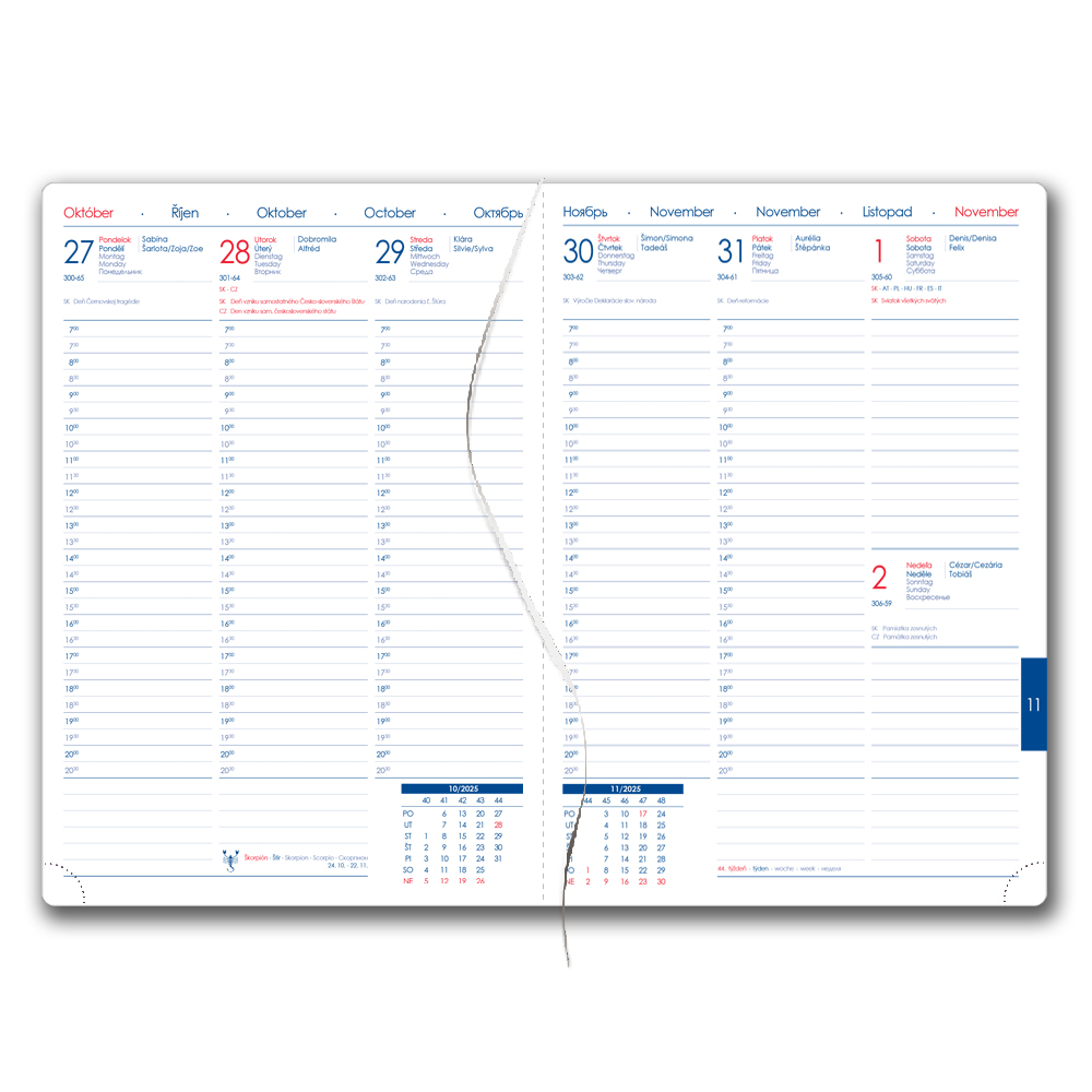 Format: A5 Rozmiar bloku: 143 x 205 mm Ilość stron: 142 stron Wiązanie: szew V8 (tkana nić) Kalendarium: tygodniowe słowackie z imieninami Mutacje językowe: SK, CZ, EN, DE, RU Kolor bloku: biały Kolor czcionki: niebieski i czerwony Materiał: pian