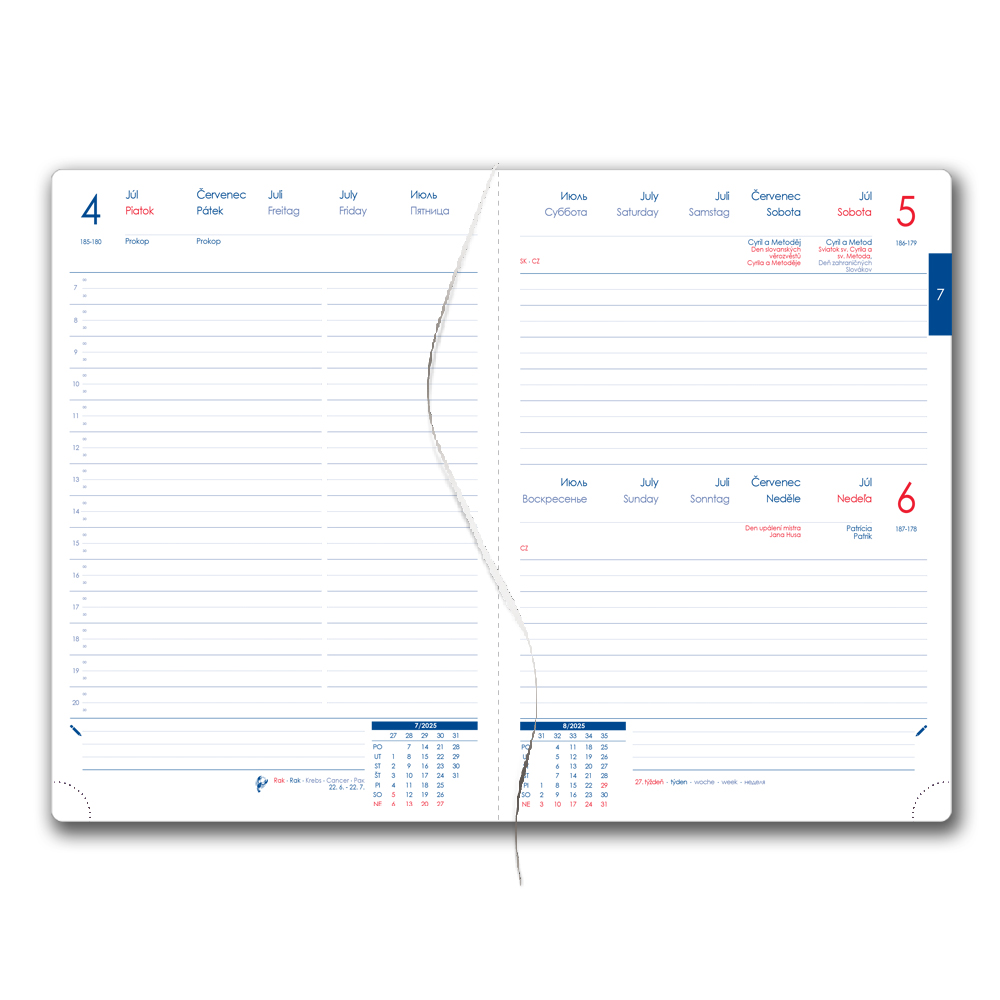 Format: A5 Rozmiar bloku: 143 x 205 mm Ilość stron: 350 stron Wiązanie: szew V8 (tkana nić) Kalendarium: dzienne słowackie z imieninami Mutacje językowe: SK, CZ, EN, DE, RU Kolor bloku: biały Kolor czcionki: niebieski i czerwony Materiał: matowa