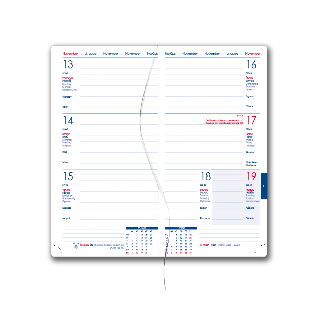 Format: kieszonkowy Rozmiar bloku: 80 x 150 mm Ilość stron: 140 stron Wiązanie: szew V8 (tkana nić) Kalendarium: tygodniowe słowackie z imieninami Mutacje językowe: SK, CZ, EN, DE, RU Kolor bloku: biały Kolor czcionki: niebieski i czerwony Mate