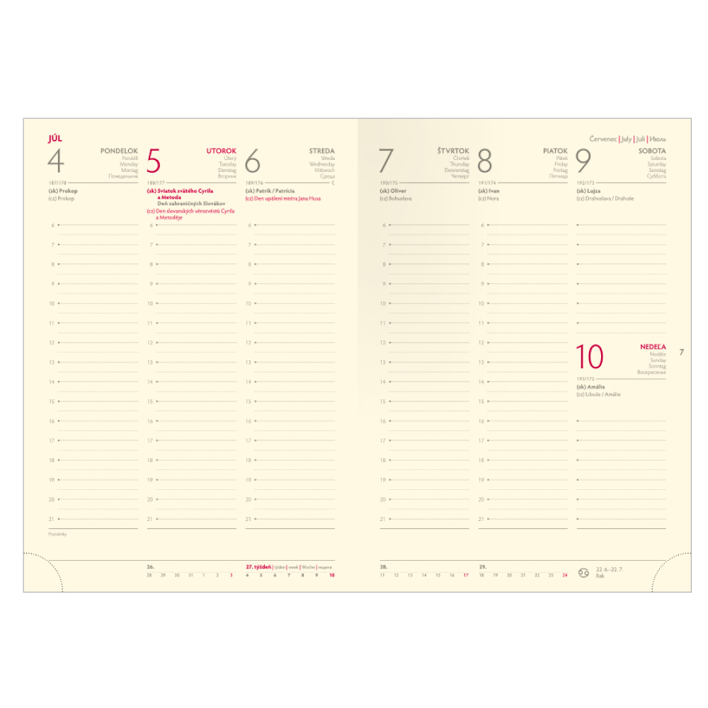 Kalendarz książkowy słowacki Carus 2016 tygodniowy B5 - czarny Format: 165 x 240 mm Kalendarium: tygodniowe Zakres: 144 stron, papier - chamois Materiał wierzchni: skóra Główny język: słowacki, inne języki: CZ, ANG, D, RU Strony informacyjne: słowackie i