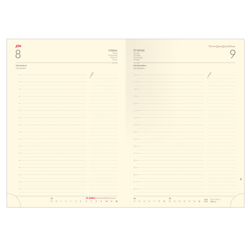Kalendarz książkowy słowacki Janus 2016 dzienny A5 - oliwkowy Format: 148 x 210 mm Kalendarium: dzienne Zakres: 352 stron, papier - chamois Materiał wierzchni: skóra ekologiczna Główny język: słowacki, inne języki: CZ, ANG, D, RU Strony informacyjne: słow