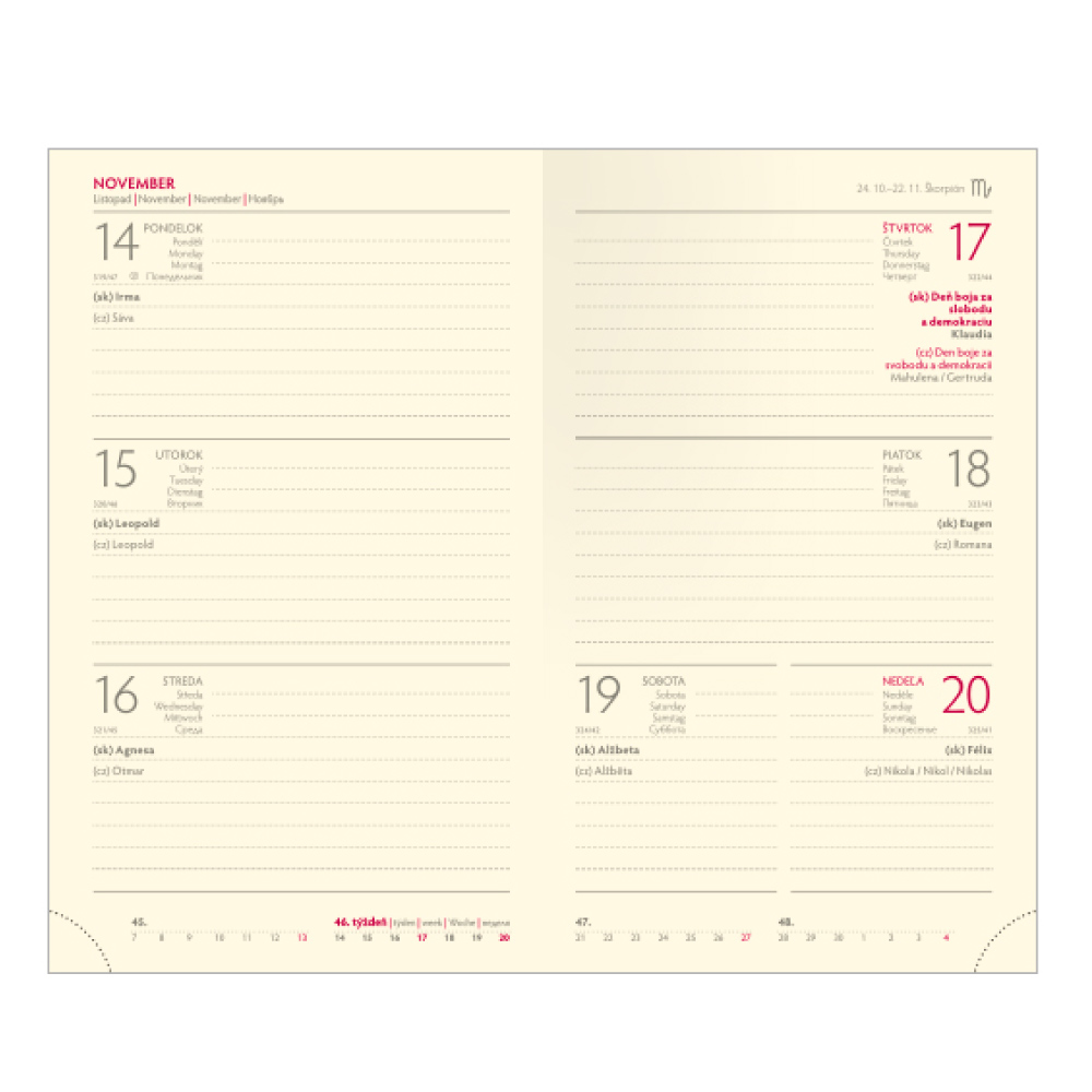 Kalendarz książkowy słowacki Kronos 2016 tygodniowy kieszonkowy - zielony Format: 90 x 150 mm Kalendarium: tygodniowe Zakres: 144 stron, papier - chamois Materiał wierzchni: balacron Główny język: słowacki, inne języki: CZ, ANG, D, RU Strony informacyjne: