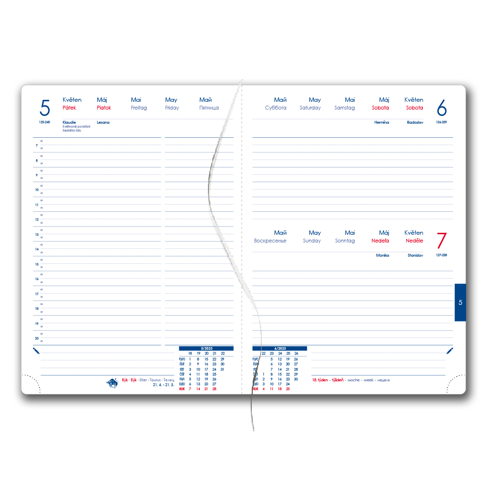 Format: B6 Rozmiar bloku: 120 x 165 mm Ilość stron: 352 stron Wiązanie: szew V8 Kalendarium: dzienne czeskie i słowackie z imieninami Mutacje językowe: PL, EN, DE, RU Kolor bloku: biały Kolor czcionki: niebieski i czerwony Materiał wierzchni: s