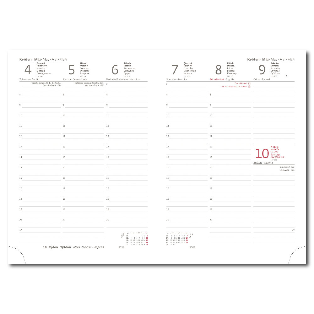 Rozmiar: 145 x 205 mm Format: A5 Kalendarium: tygodniowe czeskie/słowackie Liczba stron: 128 Kolor bloku: biały Wiązanie: V8 Materiał: laminowanie z efektem jedwabiu Zawiera: dane osobowe, planer urlopów, kalendarz planowania, numery kierunkowe