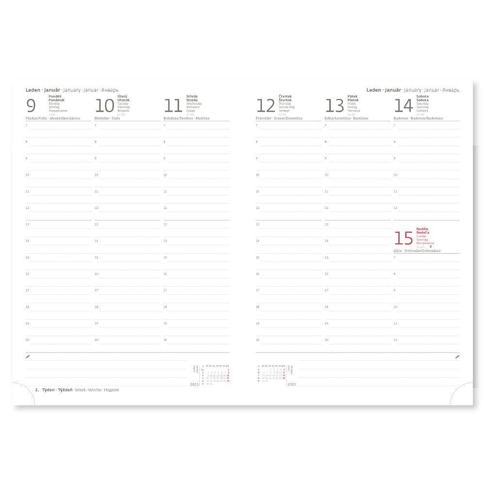 Rozmiar: 170 x 240 mm Format: B5 Kalendarium: tygodniowe czeskie/słowackie Liczba stron: 128 Kolor bloku: biały Wiązanie: V8 Materiał: matowa skóra ekologiczna Zawiera: dane osobowe, planer urlopów, kalendarz planowania, numery kierunkowe, świę