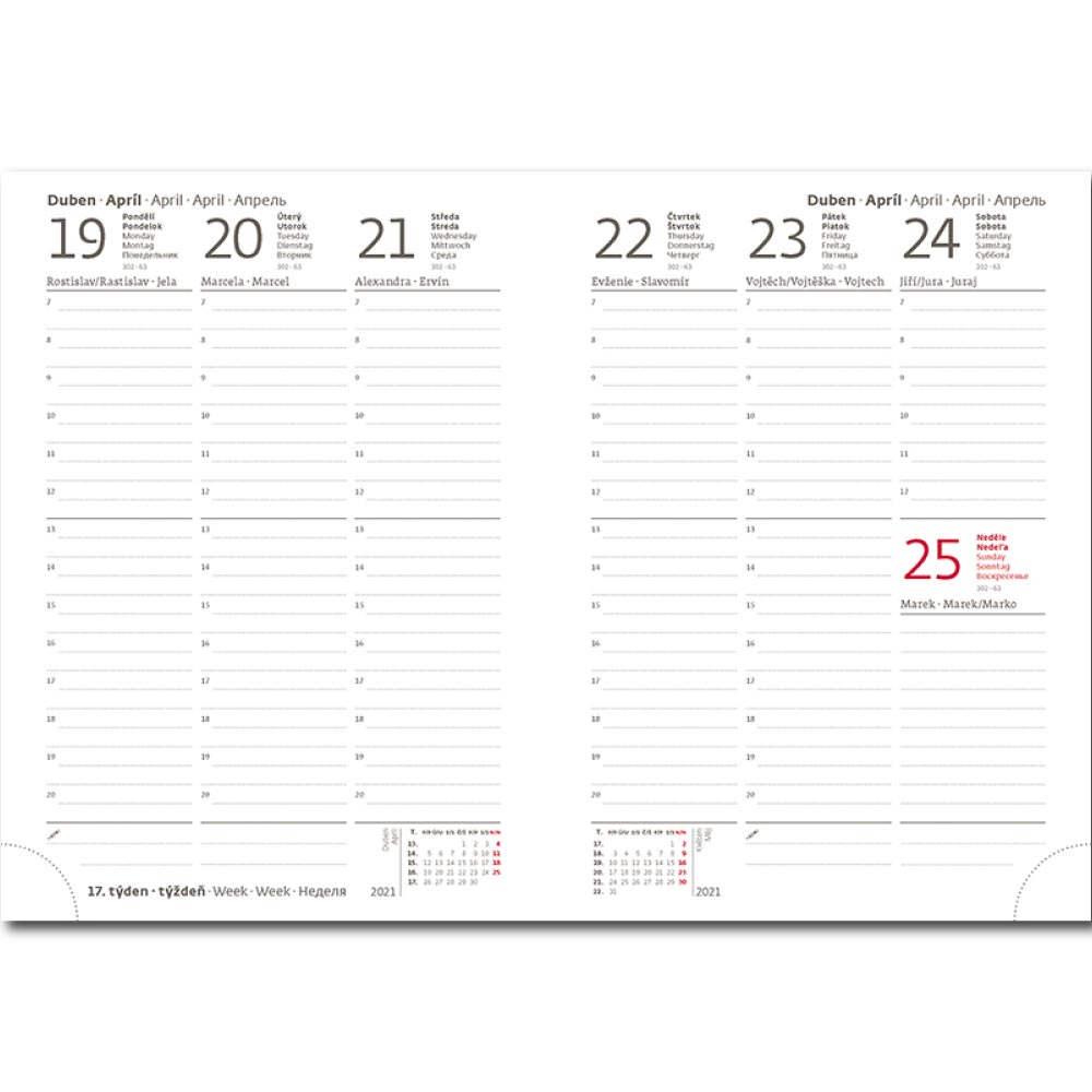 Rozmiar: 120 x 165 mm Format: B6 Kalendarium: tygodniowe czeskie/słowackie Liczba stron: 128 Kolor bloku: biały Wiązanie: V8 Materiał: matowy gładki papier Zawiera: dane osobowe, planer urlopów, kalendarz planowania, numery kierunkowe, święta p