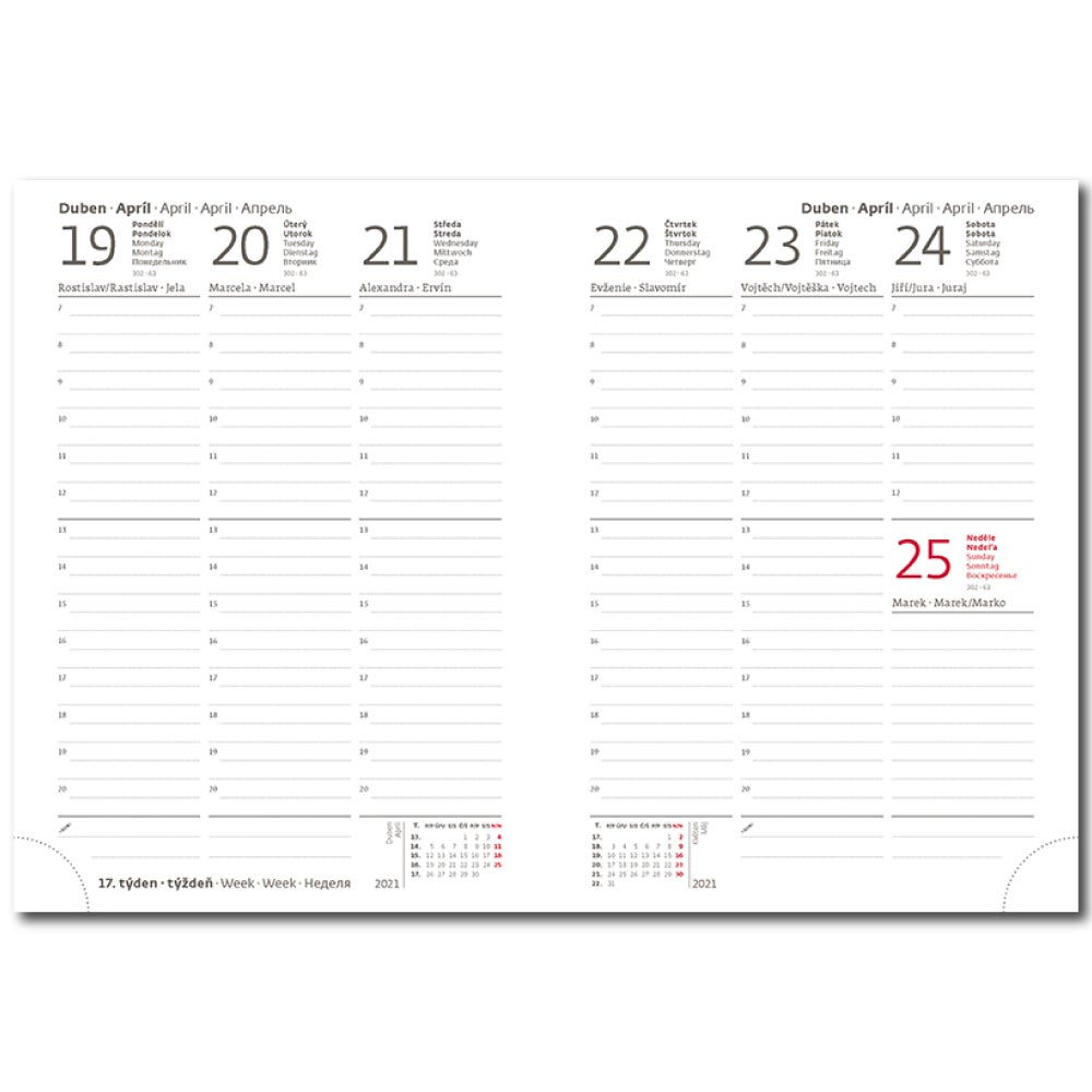 Rozmiar: 120 x 165 mm Format: B6 Kalendarium: tygodniowe czeskie/słowackie Liczba stron: 128 Kolor bloku: biały Wiązanie: V8 Materiał: laminowanie z efektem jedwabiu Zawiera: dane osobowe, planer urlopów, kalendarz planowania, numery kierunkowe