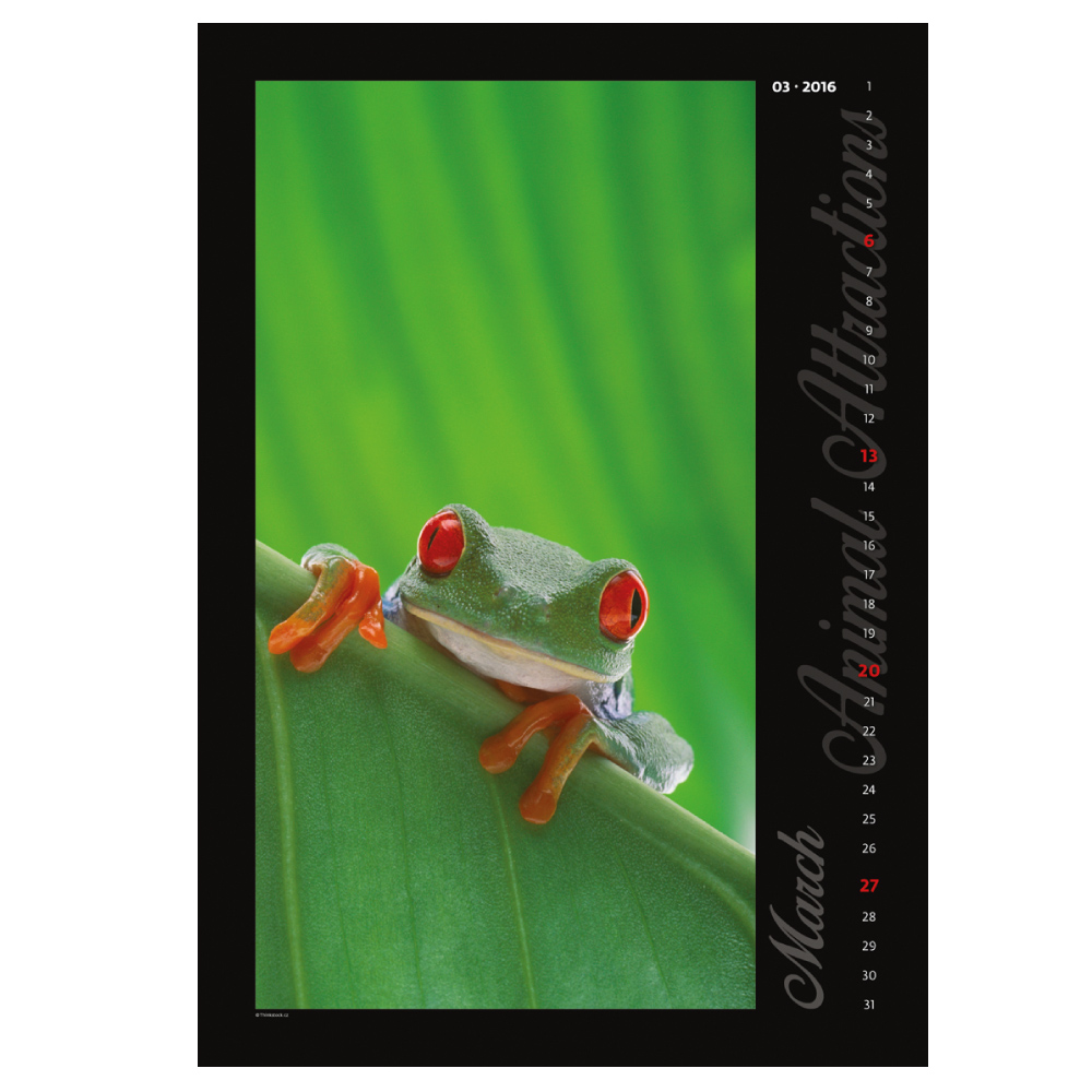 Ścienny kalendarz Animal Attractions 2016 format - 31,5 x 45 cm kalendarium - miesięczne międzynarodowe zakres kalendarza - 7 arkuszy łączenie: podwójna spirala obszar zadruku - 31,5 x 7 cm