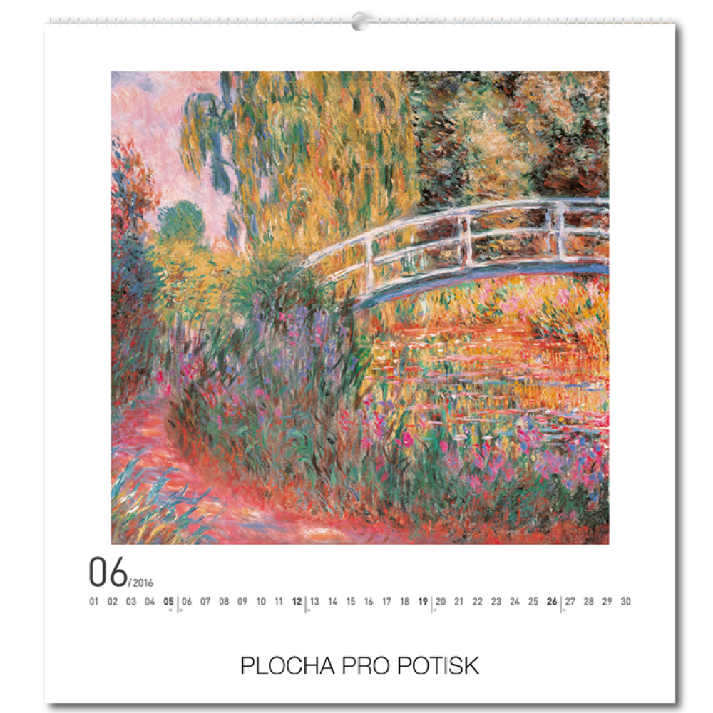 Ścienny kalendarz Claude Monet 2016 format - 48 x 46 cm kalendarium - neutralne zakres kalendarza - 14 arkuszy łączenie: podwójna spirala gramatura papieru: 170 g/m2 pakowane pojedynczo w folię, obszar zadruku: 48 x 6 cm