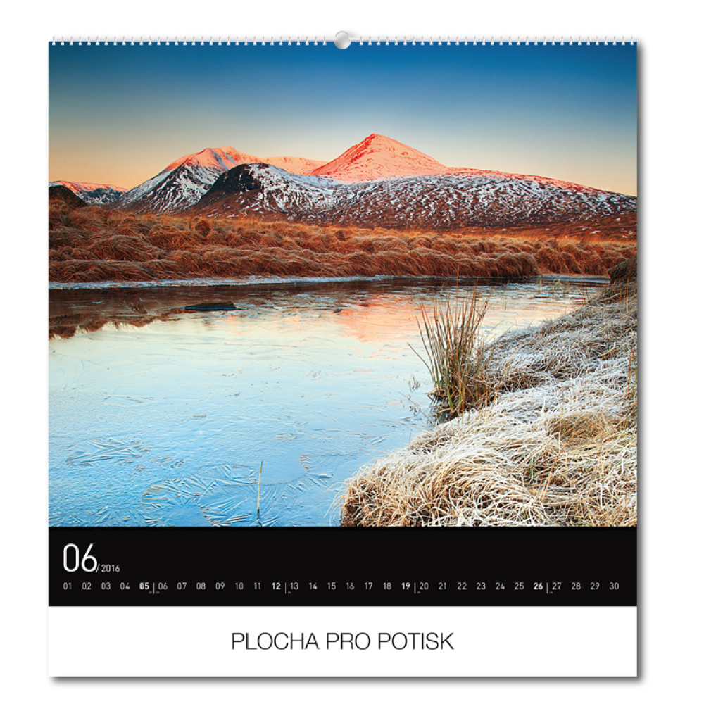 Nástěnný kalendář 2016 Hory Rozměr: 48 x 46 cm Rozsah: 14 listů Papír: 170 g/m2 Vazba: dvojitá spirála Balení: jednotlivě v tašce Plocha pro potisk: 48 x 6 cm
