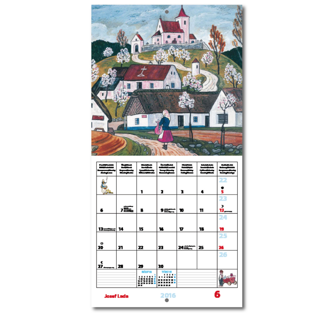 Ścienny kalendarz Josef Lada, w gospodzie 2016 format - 30 x 30 cm kalendarium - 8-języczne (CZ, SK, HU, PL, RU, GB, DE, ES)/ 16 miesięczne zakres kalendarza - 7 arkuszy łączenie: szew V1 gramatura papieru: okładka 250 g/m2, reszta arkuszy 135 g/m2 pakowa