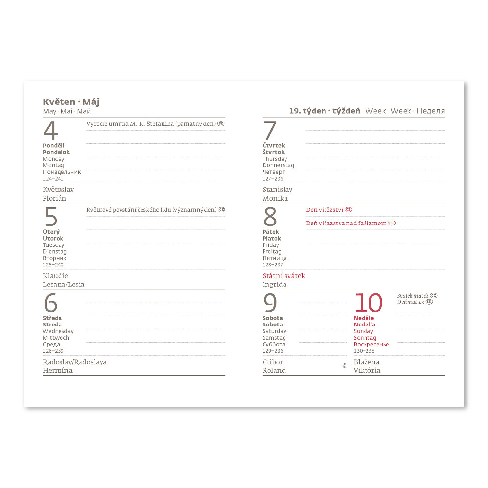 Zawiera: dane osobowe, kalendarz planowania, święta państwowe w Czechach/Słowacji,