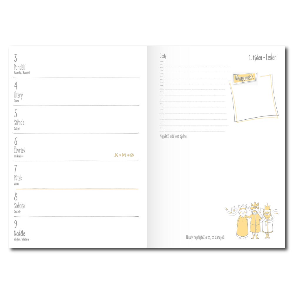 Rozmiar: 130 x 190 mm Kalendarium: tygodniowe czeskie Wiązanie: Twin wire Zakres: 160 stron Kolor bloku: biały Pamiętnik pełen zabawnych ilustracji i inspiracji. Pamiętnik zawiera gumkę do zamykania, pętelkę na długopis i kreatywne naklejki.
