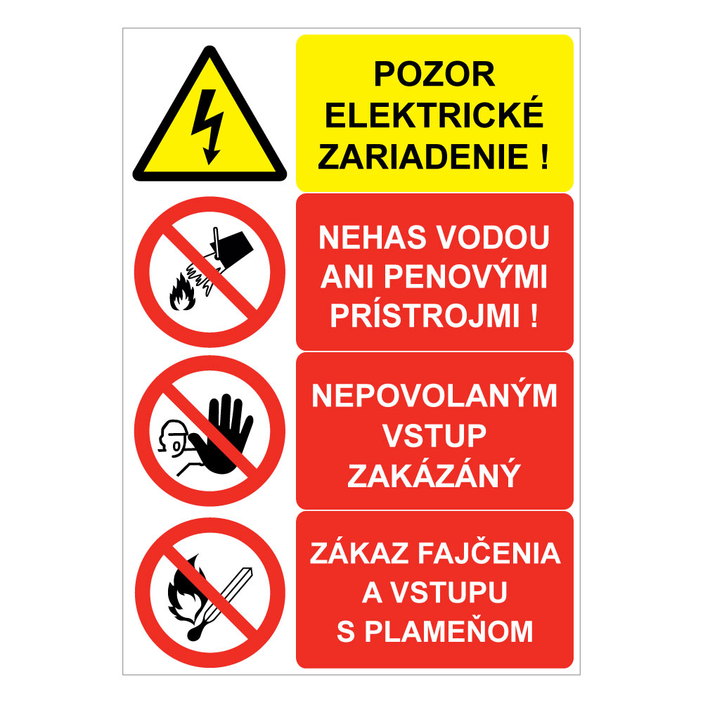 Pozor el. zariadenie-Nehas vodou-Nepovolaným vstup zakázaný-Zákaz fajčenia, kombinácia,plast 1mm,210x297mm