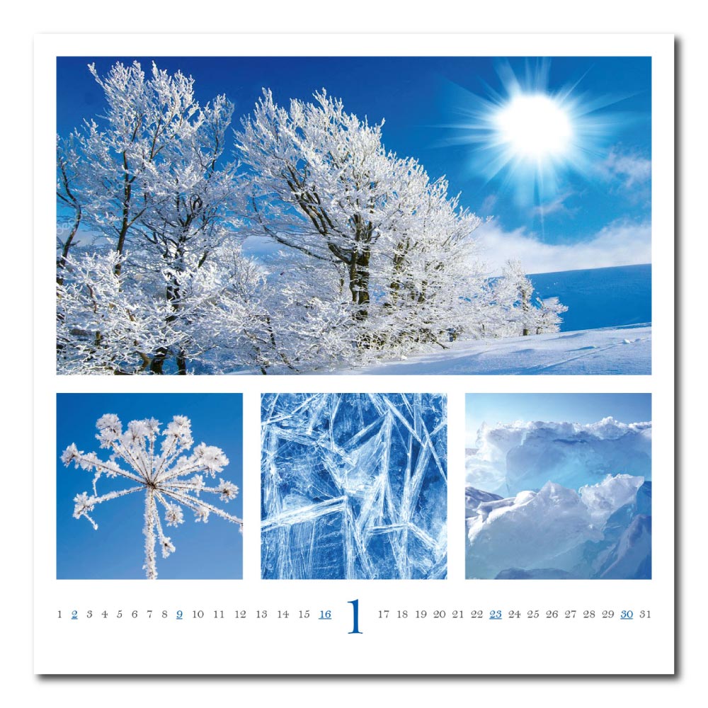 Rozmiar: 420 x 420 mm Kalendarium: miesięczne międzynarodowe Zakres kalendarza: 14 arkuszy Obszar zadruku: 420 x 60 mm