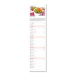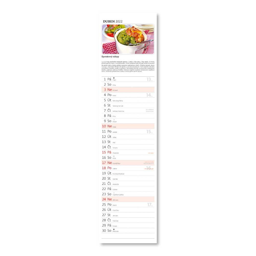Rozmiar: 12 x 48 cm Kalendarium: czeskie miesięczne z imionami Zakres kalendarza: 13 arkuszy Wiązanie: Twin wire