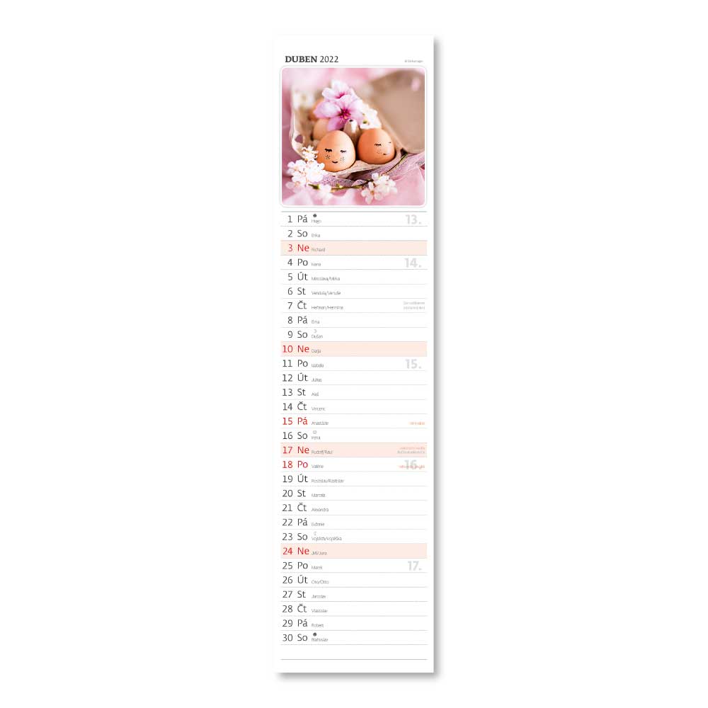 Rozmiar: 12 x 48 cm Kalendarium: czeskie miesięczne z imionami Zakres kalendarza: 13 arkuszy Wiązanie: Twin wire