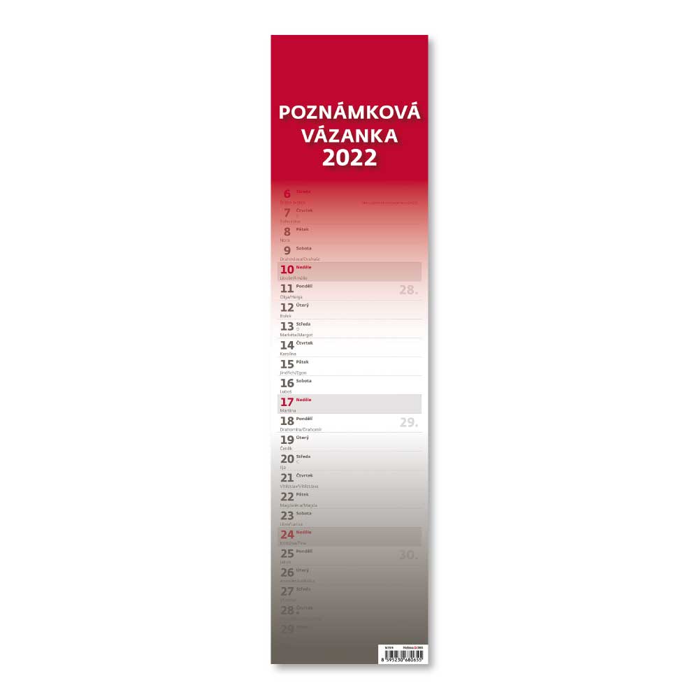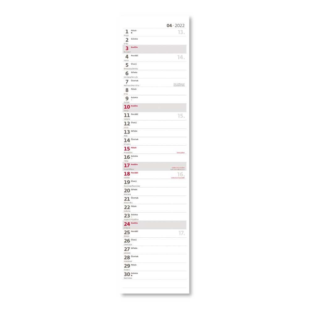 Rozmiar: 12 x 48 cm Kalendarium: czeskie miesięczne z imionami Zakres kalendarza: 13 arkuszy Wiązanie: Twin wire