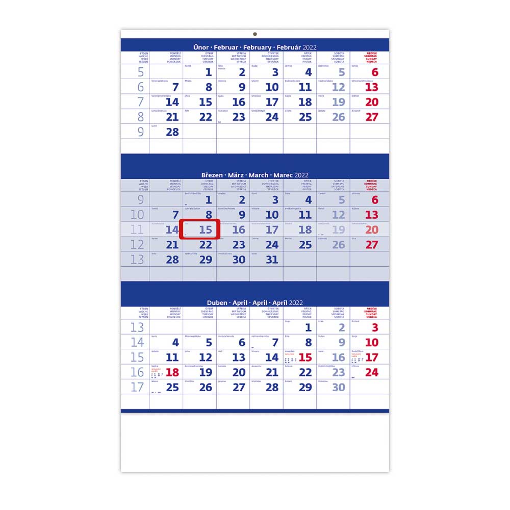 Rozmiar: 31,5 x 45 cm Kalendarium: CZ 3-miesięczne ze świętami wybranych europejskich państw Zakres kalendarza: 12 arkuszy Obszar zadruku: 31,5 x 7 cm