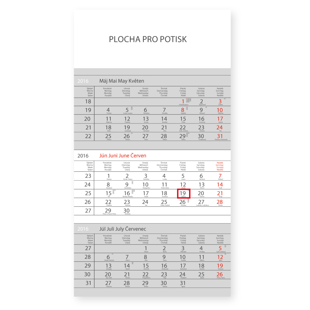 Ścienny kalendarz Standard Szary 3-miesięczny (słowackie nazwy) 2016