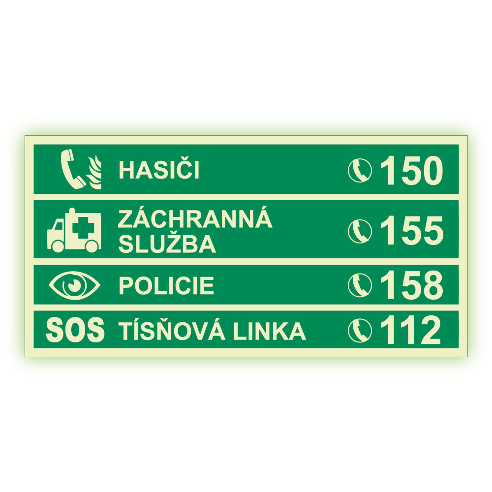 Tísňová telefonní čísla - fotoluminiscenční tabulka, plast 2 mm 300x150 mm