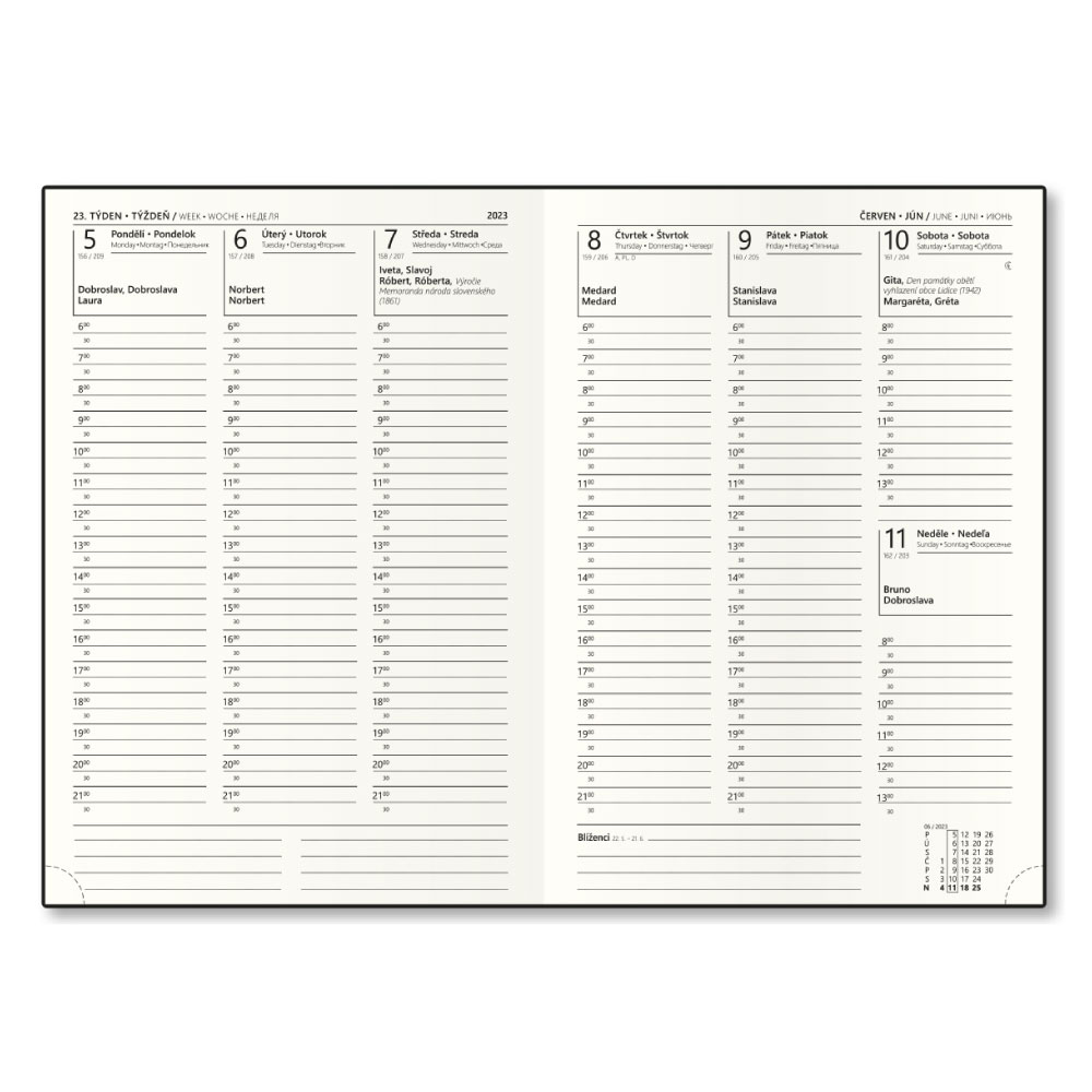 Rozmiar bloku: 143 x 205 mm Format: A5 Kalendarium: tygodniowe czeskie i słowackie z imionami Mutacje językowe: CZ, SK, ANG, D, RU Materiał wierzchni: gładka skóra ekologiczna Kolor bloku: kremowy, okrągłe odrywane rogi Ilość stron: 144 stron Wiąz