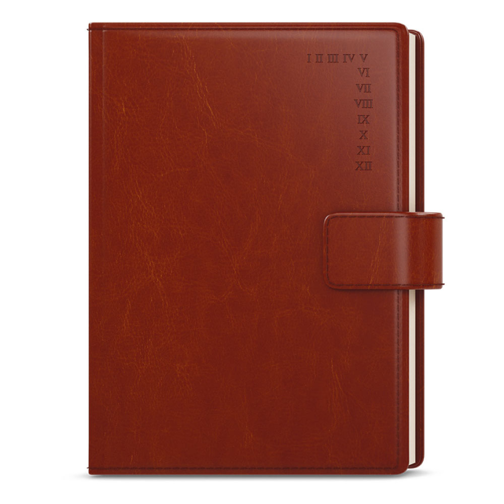 Ślepe tłoczenie roku, magnetyczne zapinanie, pętelkę na długopis, 3 wewnętrze kieszenie.