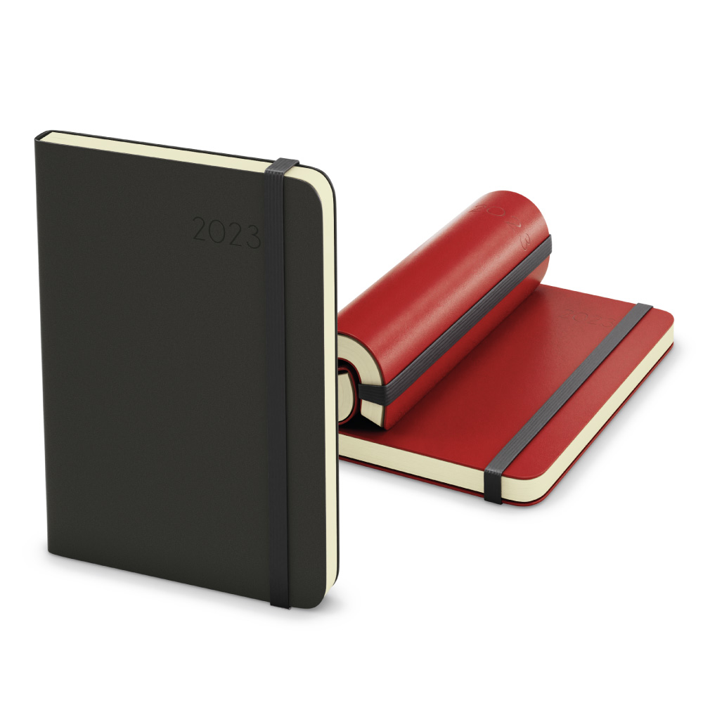 Ślepe tłoczenie roku i gumka do zamykania.